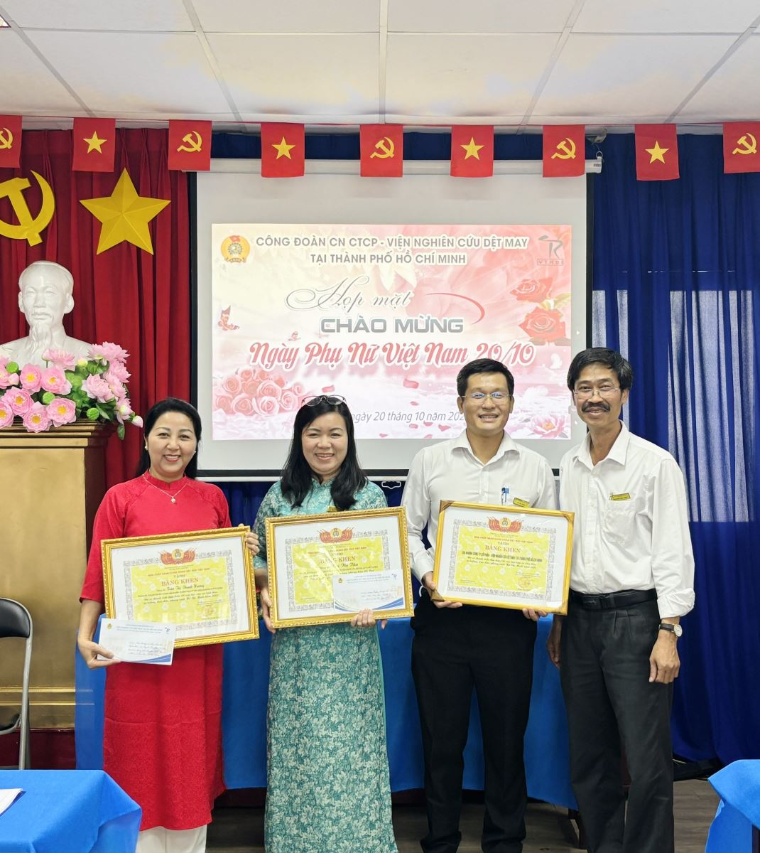 Cũng nhân dịp này, Công đoàn Chi nhánh tổ chức họp mặt chào mừng Ngày Phụ nữ Việt Nam 20/10, trao bằng khen của Công đoàn Dệt May Việt Nam cho tập thể và cá nhân đạt các thành tích trong thi đua "Giỏi việc nước, đảm việc nhà năm 2025", thi đua "Học tập và làm theo tư tưởng, đạo đức, phong cách Hồ Chí Minh năm 2025"